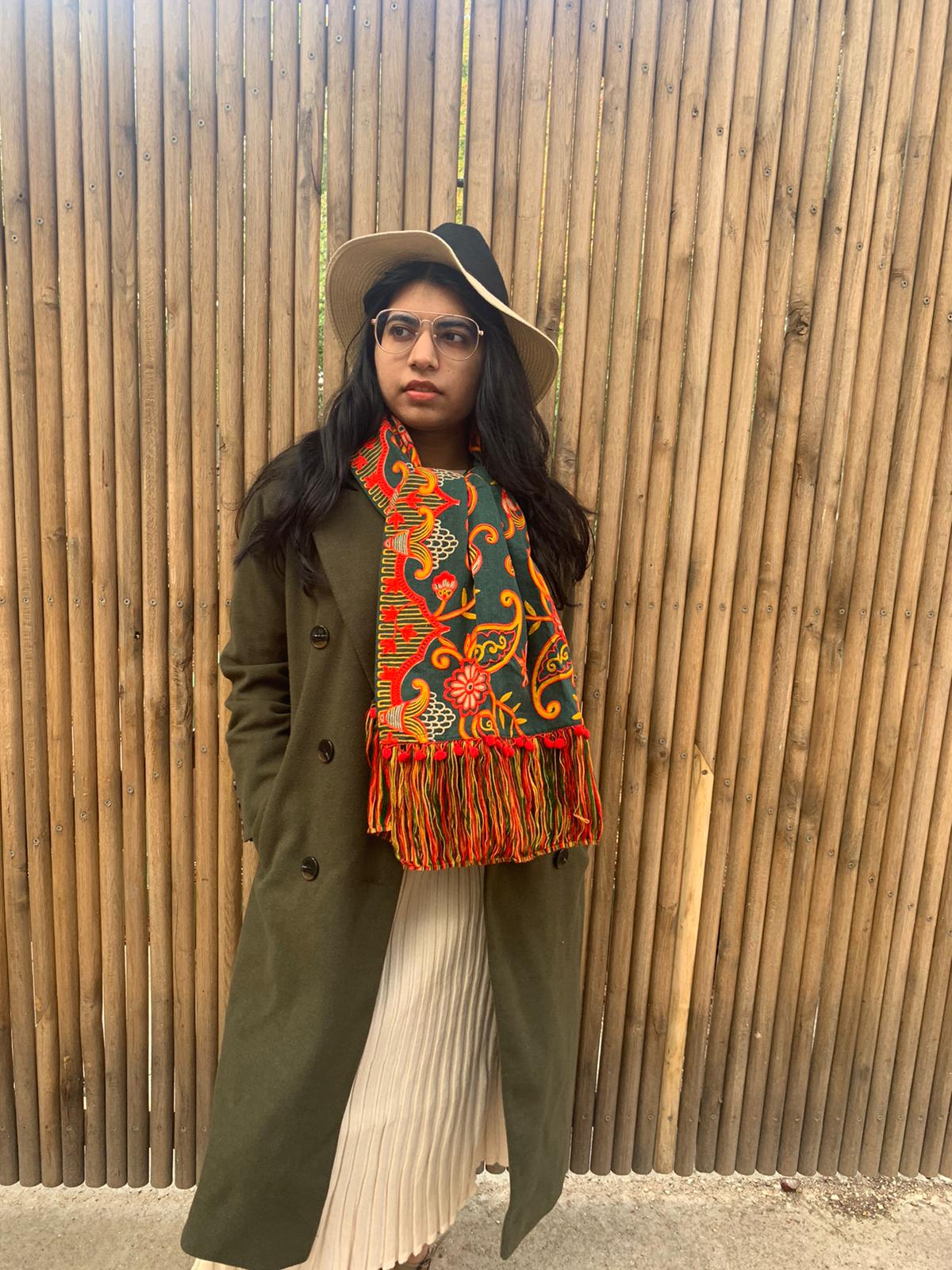 Restez au chaud pendant la saison froide avec cette écharpe brodée en laine. Les motifs apportent un côté ethnique et le vert profond ira parfaitement avec vos tenues d'automne et d'hiver.